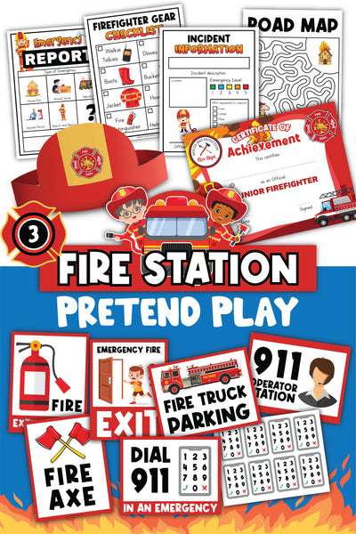 The printable fire station role play set includes emergency report cards, junior firefighter training certificate, 911 phone and printable play phones to practice calling the fire engine out!