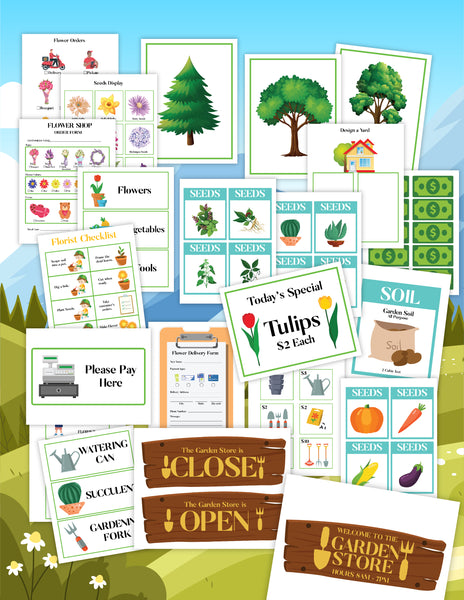The set includes delivery order forms, a florist's checklist, design a flower garden sheet, covers for seed display packets, delivery forms for payment, prices lists, labels, play money and more.